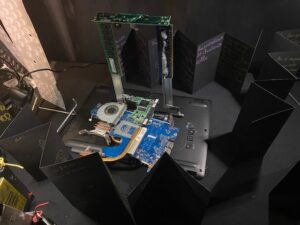 Inspirés par cette démarche, les élèves se sont lancés à leur tour dans la création : seuls ou en petits groupes, ils ont démonté, trié et réorganisé des composants électroniques pour réaliser leurs propres sculptures. Un groupe a également réalisé une vidéo retraçant la construction d’une spirale.